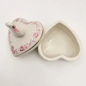 Heart Shaped Ceramic Trinket Box Swan Figurine Pink Floral Gold Trim Cottagecore