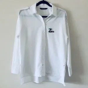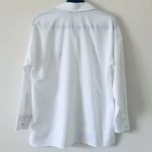 Zara Basic White Oversized Button-Down Boyfriend Shirt with Zara Logo (Z1975) beautifully embroidered on the front left side of the chest. This shirt has a High-Low hem, it is a loose-fitting boyfriend collared shirt with long sleeves. Materials are 100% Cotton. Size is US M. Measures 20” approx from pit to pit and the total length is 26” at The front and 28” at the back approximately. Brand New Without Tag.