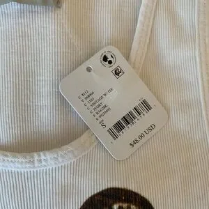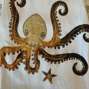 White ribbed tank top with a large octopus graphic on front. Gold and brown tones in the octopus print. Casual, beach-ready look. Soft stretch fabric.