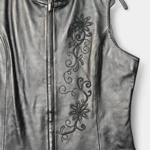 Edgy, biker, moto, western, floral embroidery, sleeveless vest, leather vest, casual, festival, boho, chic, retro, vintage-inspired