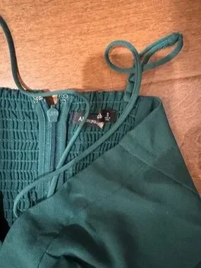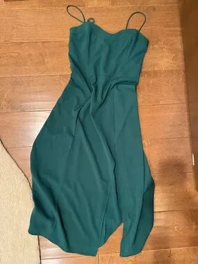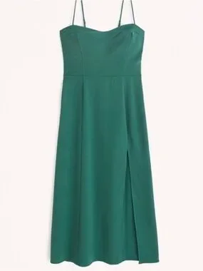 Elegant green midi dress with delicate spaghetti straps. Features a fitted bodice and a subtle side slit for effortless movement. Lightweight fabric and a timeless silhouette for versatile wear.