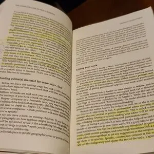There is highlighting and writing in book. One page has some holes....see pic.