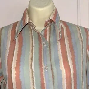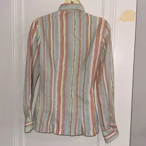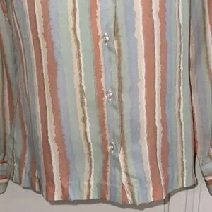 Vintage 70s College Town Striped Orange, Blue, Green, Tan & Cream Long Sleeve Triacetate/Nylon Shirt