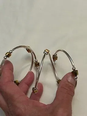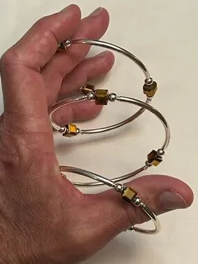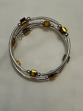 Elegant silver-tone coil bracelet featuring amber gold-colored cube beads. Lightweight, flexible design for easy wear. Amber beads add warm, sophisticated color to any outfit. Polished silver finish provides a modern, versatile look, adjustable size