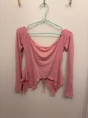Off-shoulder crop top with center ruched drawstring. Long sleeves with slight bell at cuffs. Raw hemline and front tie detail. Soft lightweight knit for easy layering.