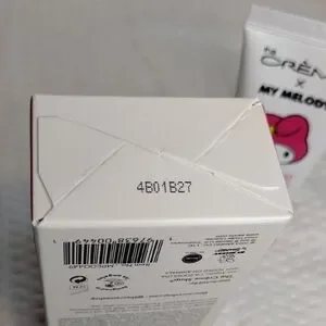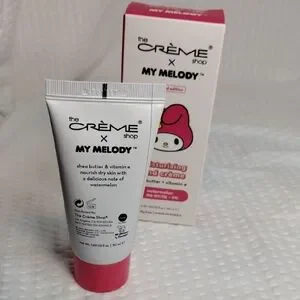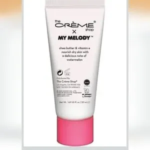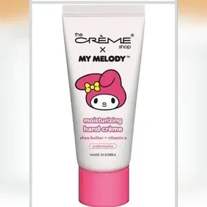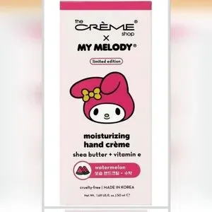 The Crème Shop x My Melody moisturizing hand crème. Features My Melody character and watermelon scent. Pink and white packaging. Travel-friendly tube.