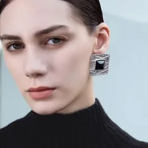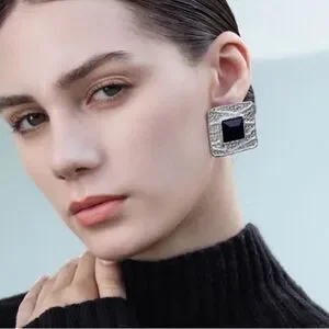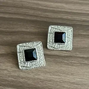 These elegant square earrings feature a striking black centerpiece set in a textured silver frame. Perfect for adding a touch of sophistication to any outfit.