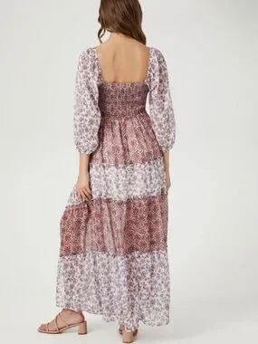 Beautiful flowy maxi dress from Forever 21 featuring a soft, romantic floral patchwork print in muted pinks and creams. Super flattering silhouette with a fitted bodice and breezy skirt.