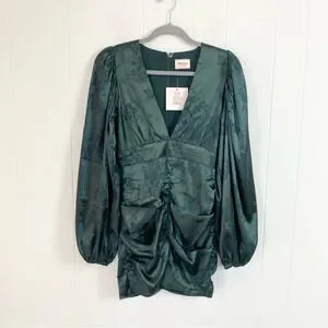 NWT Showpo RICHMOND JACQUARD FLORAL LONG SLEEVE RUCHED MINI DRESS GREEN SZ 4
