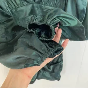 This stunning Showpo Richmond Jacquard Floral Long Sleeve Rushed Mini Dress in size 4 is perfect for any occasion. The dress features beautiful floral patterns, with a green color scheme, and is made from high-quality jacquard fabric. The dress has long puff sleeves and a bodycon style, with a short length that is perfect for a night out or a special event.