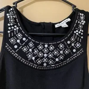 Stylish black mini dress with detailed studded neckline. Perfect for evening wear.