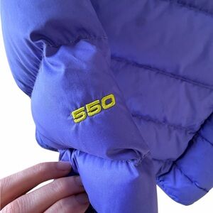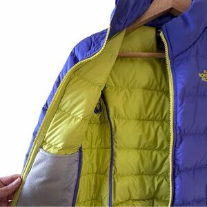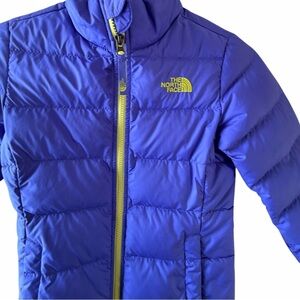 Vibrant blue puffer coat by The North Face. Ideal for cold weather. Lightweight and cozy.
