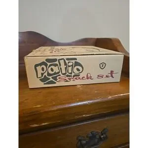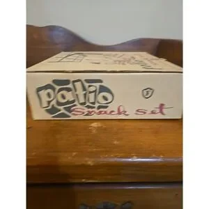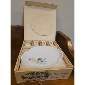 This MCM style snack set includes 4 milk glass cups and 4 milk glass serving plates that include a little spot for the cup. Doesn't appear to have been used, no stains or chips. See photos as they are part of the condition description.