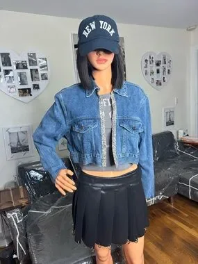 Cropped Blue Denim Jacket with Custom Rhinestone Trim