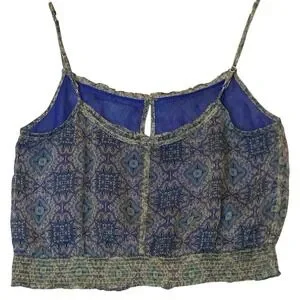 Bohemian, Indie, Hippie, Gypsy, Vintage Inspired, Cottagecore, Prairie, Coastal Cowgirl, Blue, Navy Blue, Periwinkle, Lavender, Paisley, Medallion, Tile Print, Moroccan Print, Geometric, Ornate, Abstract, Patterned, Mandala, Keyhole, Smocked, Cinched Waist, Elastic Waist, Spaghetti Strap, Adjustable Straps, Camisole, Cami, Sleeveless, Flowy, Lightweight, Lined, Relaxed Fit, Summer, Spring, Beach, Vacation, Travel, Casual, Everyday, Layering, Trendy, Cute, Feminine, Effortless, Chic, Laid-back, Comfortable, Breathable