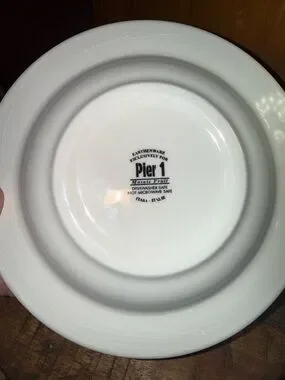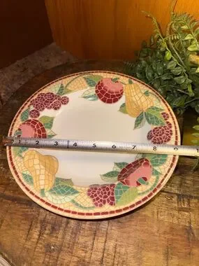 Pier 1 Mosaic Fruit Earthenware Soup Bowls Set of 6, Multicolor, Dishwasher Safe. Colorful fruit mosaic rim on ceramic soup bowls. Red apples, yellow pears and green leaves accent a cream background. Glazed finish adds subtle shine. Ideal for casual tables and everyday use.