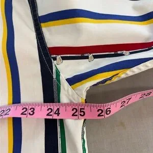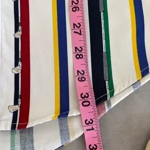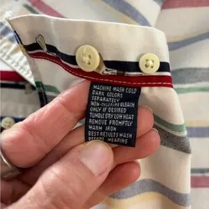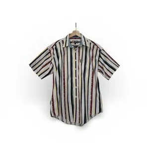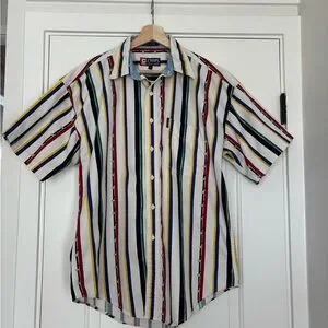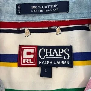 Vintage Chaps Ralph Lauren short-sleeve button-up shirt featuring bold vertical multicolor stripes with a subtle golf club novelty print woven throughout. Made from 100% cotton and produced in Thailand, this shirt reflects the classic late-1990s to early-2000s Chaps era known for quality construction and playful preppy design. Cut in a relaxed, boxy fit with a button-down collar and chest pocket. A great piece for golfcore, preppy, resort, or vintage-inspired styling. Please refer to measurements for best fit.***Please note some writing on the inside of the bottom of the shirt. It has not come through the fabric and you cannot see it on the front side. Please see pictures for details. Shirt is in very good used condition given its age.