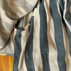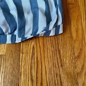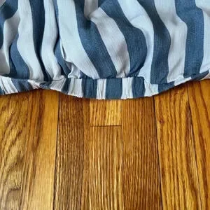 American Eagle Outfitters off the shoulder top, size small. Blue and white striped, elastic waist with decorative tie. In good used condition, no rips or tears. Please look at the pictures there is something weird about the waist elastic, not really sewn evenly.
