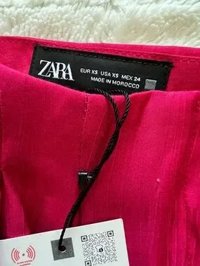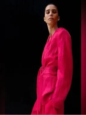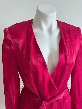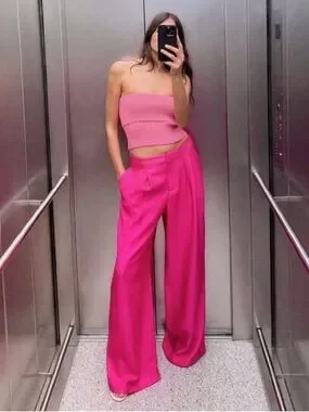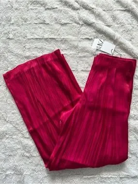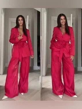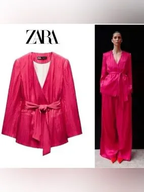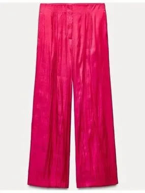 Zara NEW Crinkle Satin Blazer and Wide Leg Trousers SET Fuchsia Pink XS Shiny