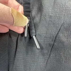 Condition: Pre-owned pants with lightweight stretch woven fabric showing light general wear, mild wrinkling from wash and storage, and a few small lint or fuzz specks as shown in photos. Fabric, seams, waistband, drawstring tips, pockets, zipper closures, and cuffed hems are clean and structurally intact with no stains, holes, or snags; pants are stored folded in a clear poly bag and may arrive with light creasing from storage and handling.
