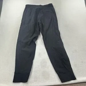 Pre-owned pants with lightweight stretch woven fabric showing light general wear, mild wrinkling from wash and storage, and a few small lint or fuzz specks as shown in photos. Fabric, seams, waistband, drawstring tips, pockets, zipper closures, and cuffed hems are clean and structurally intact with no stains, holes, or snags; pants are stored folded in a clear poly bag and may arrive with light creasing from storage and handling.