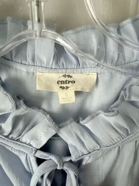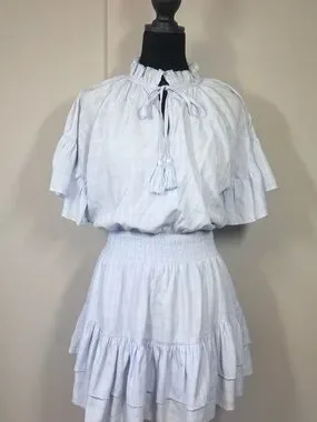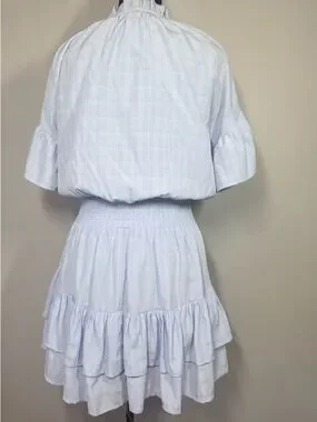 Soft light-blue short tiered dress with ruffled neckline. Front tie detail adds a feminine touch. Lightweight, flowy fabric. Versatile for casual or dressy looks.