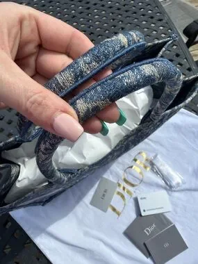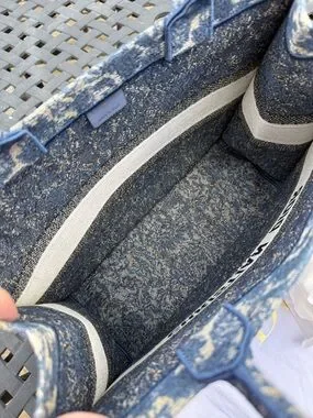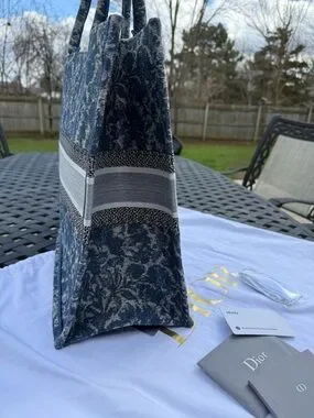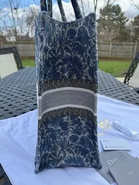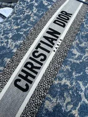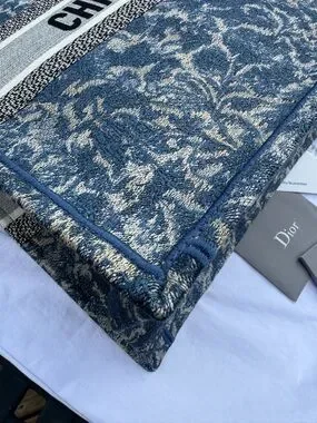 The popular Dior Book tote finely crafted from embroidered canvas in a pale blue Brocart motif, it embodies the effortless elegance of the Dior aesthetic. Featuring rolled top handles and the iconic CHRISTIAN DIOR PARIS embroidery across the front, its open-top design reveals a spacious interior — perfect for daily essentials or travel.