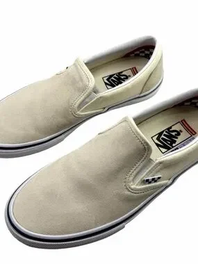 Classic Vans slip-on profile in off-white suede. Elastic side accents for easy on-and-off. Cushioned insole for everyday comfort. Durable rubber outsole with signature foxing stripe.