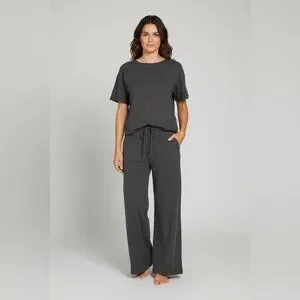 Soft charcoal two-piece lounge set. Short sleeve crew top with drawstring wide leg pants. Lightweight, cozy fabric. Effortless everyday comfort.
