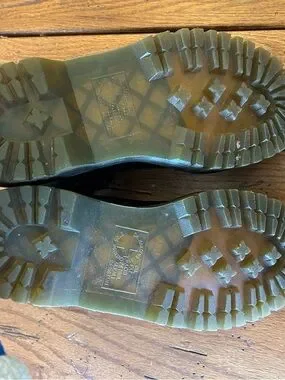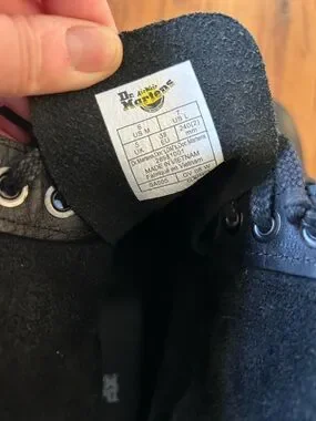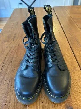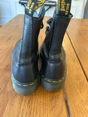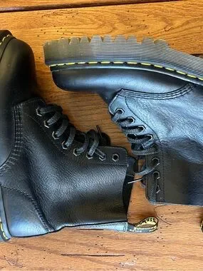 Iconic Dr. Martens black leather boots with signature yellow welt stitching. Sturdy lug sole for traction. Classic lace-up design for secure fit. Timeless workwear and casual style.