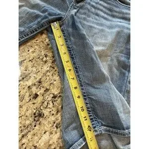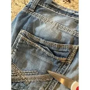 The BKE Buckle Tyler Jean Shorts in men's size 33 are a stylish and versatile addition to any wardrobe. Featuring a blue denim fabric with a light wash and embroidered accents, these Bermuda-style shorts have a mid-rise fit with a zip closure and 5-pocket design. Perfect for a casual day out or a workwear setting, these shorts offer comfort and durability with their stretch material and easy-care properties. The solid blue color and various themes make them a great choice for summer, fall, or spring seasons.