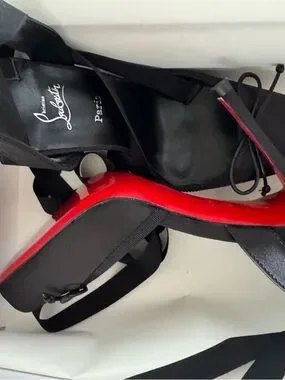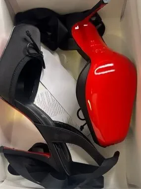 Elegant black satin ankle-tie heels. Distinct glossy red soles. Sleek pointed silhouette. Feminine bow detail at the toe. Strappy ankle ribbons for a secure fit.