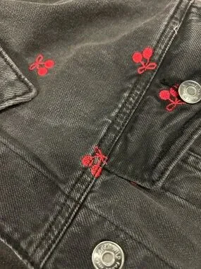 Sleeveless black denim vest with small red cherry embroidery scattered across the fabric. Button-front closure and chest pockets. Frayed hem adds an edgy finish. Size large. Can fit a small xl.