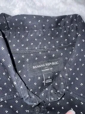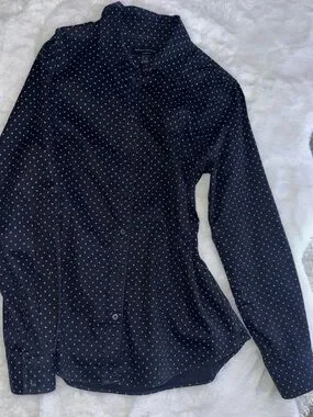 Tailored-fit button-up top. Navy fabric with scattered white dot pattern. Lightweight and polished. Easy to pair with work or casual looks.