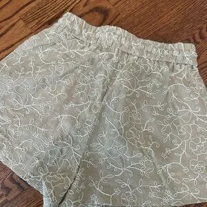 Light beige embroidered shorts with an elastic waist and drawstring for a comfortable fit. Delicate white floral embroidery adds a feminine touch. Versatile beige color pairs easily with tops for everyday wear.