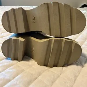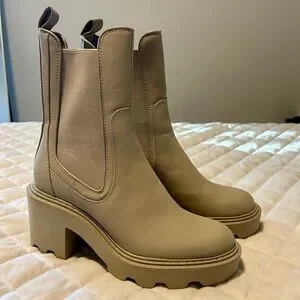 These are the Zara Rubberized Heeled Ankle Boots, known for their chunky lug sole and elastic side panels in a beige or ecru color.