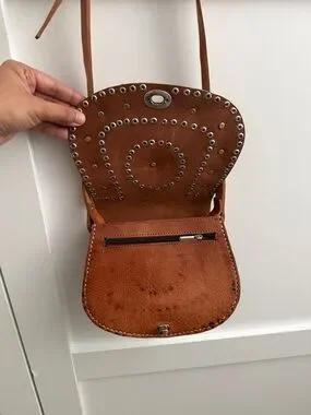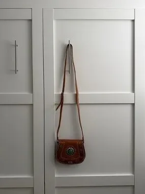 Stylish brown leather crossbody with decorative turquoise medallion and metallic stud accents. Features a secure turn-lock closure and an adjustable shoulder strap. Perfect for everyday use and adding a boho-chic touch to outfits.