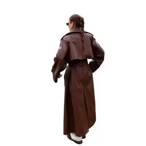 This brand new brown faux leather trench coat with belt is a stylish addition to any woman's wardrobe. The classic trench coat style paired with the belted feature adds a touch of sophistication and elegance. Perfect for any occasion, this versatile coat can elevate any outfit with its timeless design and brown color. Made from high-quality faux leather, this trench coat is sure to be a standout piece in any closet.