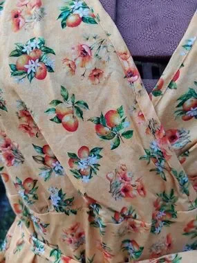 Lightweight yellow oramges printdress with a flattering V-neck and self-tie waist. Soft, breezy fabric designed for everyday comfort and effortless style. Feminine floral print and full skirt create a classic, versatile silhouette. Perfect for warm-weather outings and casual events. waist 17 bust 21