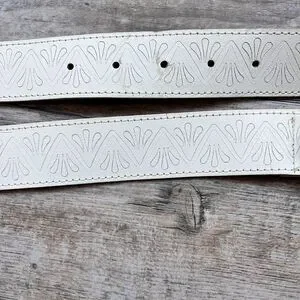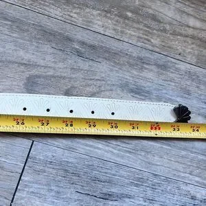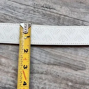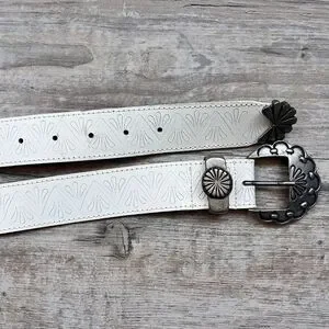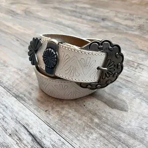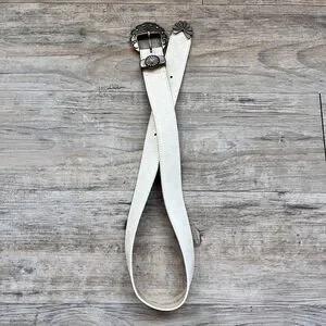 Stylish genuine leather western belt in a crisp white color featuring an embossed tooled pattern throughout for added texture and detail. Accented with a decorative silver-tone concho buckle and matching hardware, giving it a bold southwestern or vintage-inspired look. The standout buckle and tip add character while the slim profile makes it perfect for pairing with jeans, dresses, or statement outfits. Size 28, ideal for a fitted waist or low-rise styling. In good preowned condition with light signs of wear consistent with use. A unique accessory for western, boho, or Y2K-inspired fashion lovers.