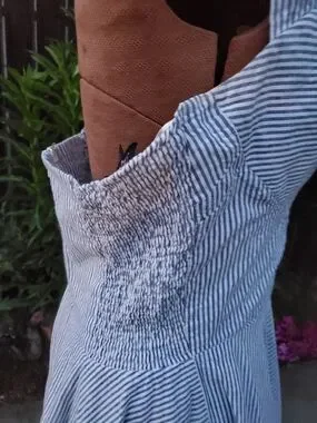 Classic halter-style fit-and-flare midi with blue and white pinstripes. Sweetheart-inspired bodice with a full, swishy skirt. Feminine and vintage-inspired silhouette. Perfect for daytime events or summer outings. waist not stretched 16, bust 20