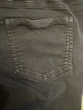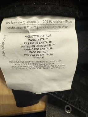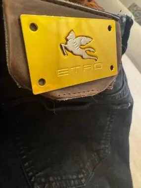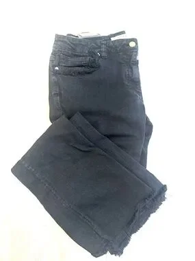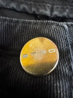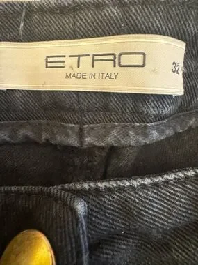 Cropped black jeans with frayed hems. High-quality Etro denim. Sleek five-pocket styling. Subtle hardware accents. Casual yet polished look.