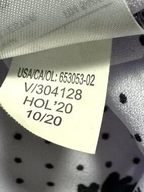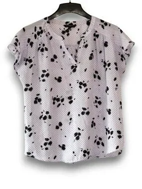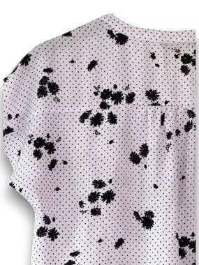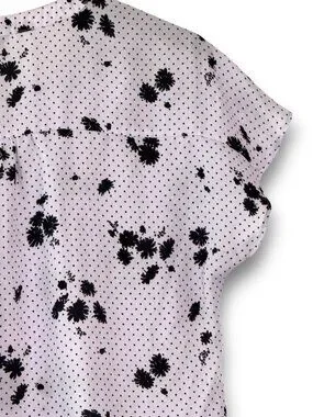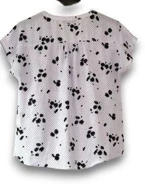 This elegant Banana Republic blouse features a charming mix of floral and polka dot prints in a classic black and white color palette. Designed with a split neckline and comfortable cap sleeves, it offers a flattering silhouette suitable for work or weekend wear. The fabric is a lightweight 100 percent polyester that is machine washable and easy to care for. This piece is from the Holiday 2020 collection.