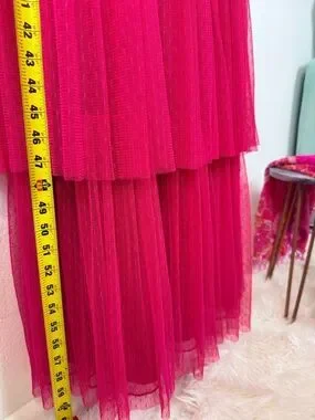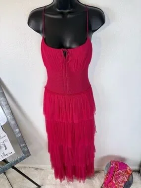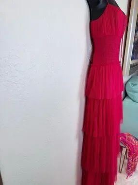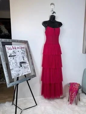 NWT ML Monique Lhuillier Tiered Tulle Maxi Dress Cherry Pink Size 8