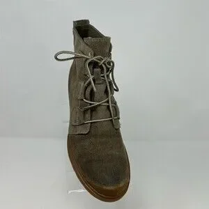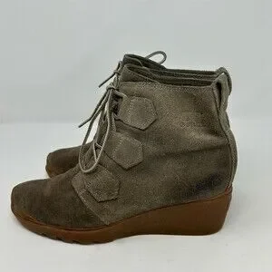 Sorel Toronto Lace Wedge women’s ankle booties in gray/taupe. US size 8.5 (UK 6.5, EU 38.5). Waterproof suede upper with lace-up closure, round toe, and pull tab. Wedge heel with rubber lugged outsole and gum sole. Made in China. Condition: pre-owned.
