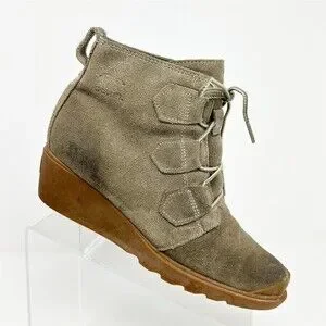 Keywords: Sorel Toronto Lace Wedge, women’s ankle boots, waterproof suede boots, lace up bootie, wedge heel boots, lug sole, gum sole, gray taupe boots, round toe boot, rubber outsole, traction sole, pull tab boots, size 8.5 women, oiled suede, Sorel booties