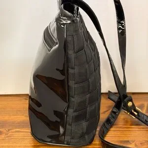 This chic and unique bag from Canadian designer Jeanne Lottie is a perfect blend of texture and shine! The main body features a cool black woven fabric/nylon in a basket-weave pattern, beautifully contrasted with glossy black patent trim on the sides, top, and the long, adjustable strap.