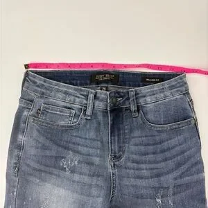 The product is a pair of stylish Judy Blue Skinny Fit Jeans in a high rise style. Made from a blend of polyester, spandex, and cotton denim fabric, these jeans feature a solid blue color with a zip and button closure. The size is 29 with a 27-inch inseam, catering to regular-sized women who appreciate a skinny fit and on-trend look. The brand Judy Blue is known for its bohemian, city-inspired designs with accents like branded buttons, zippers, and logos. These versatile jeans are perfect for a preppy or urban chic vibe.