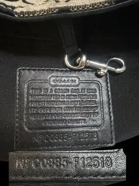• Exterior: Coach's signature C canvas with soft leather trim and embossed logo on front; Adjustable leather shoulder strap with contrast stitching; Silver nickel hardware and original hang tag