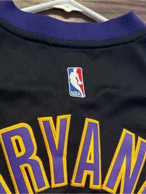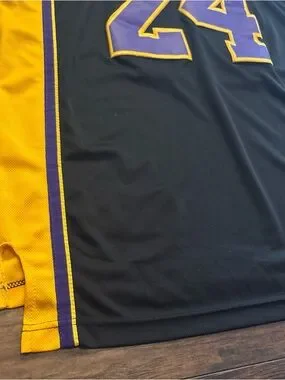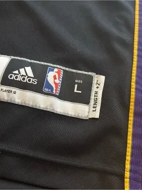 Authentic adidas NBA jersey detail. Black mesh body with purple and gold side trim. adidas and NBA labels visible. Barely worn and has sat in the closet for years